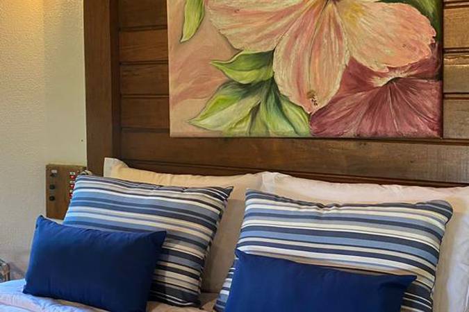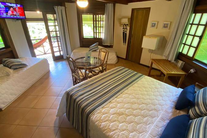 solteiro, mesa com cadeiras, varanda e vista para o nosso jardim, com as seguintes comodidades: ar condicionado, frigobar, TV, cofre e armários. A praia da Piedade fica aqui na ilha da Gipóia e você pode conhecer via trilha ou também barco.